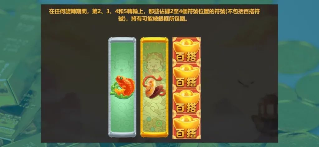 旋轉期間,四格符號組成的頂部附加軸可能會出現橫財神符號,若橫財神符號整齊排列,它會轉化成4個百搭符號,讓玩家享受更多賠付機會!